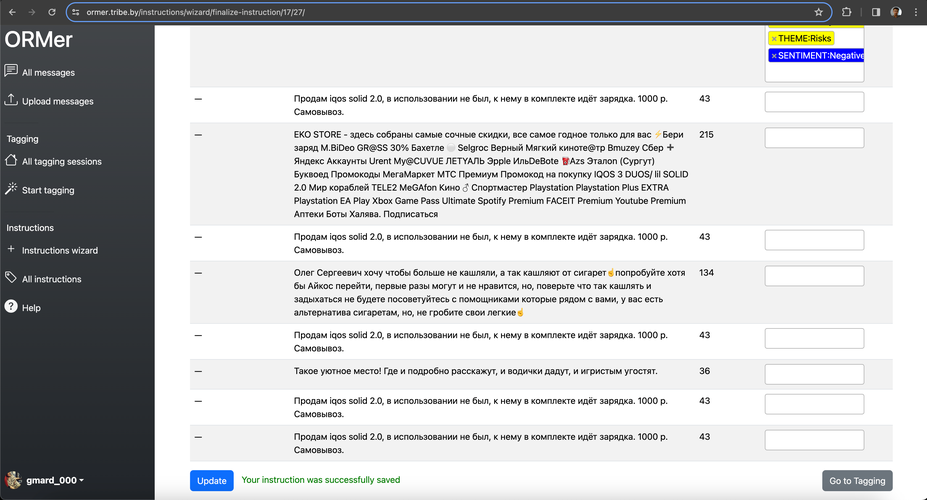 7. Расставьте теги для загруженных сообщений, выбирая их в списке. Сохраните инструкцию, нажав "Save tags" или, если вы уже сохраняли, и хотите обновить выбор тегов - "Update tags"